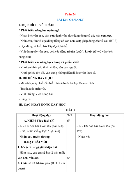 Tuần 24 BÀI 124: OEN, OET I. MỤC ĐÍCH, YÊU CẦU: