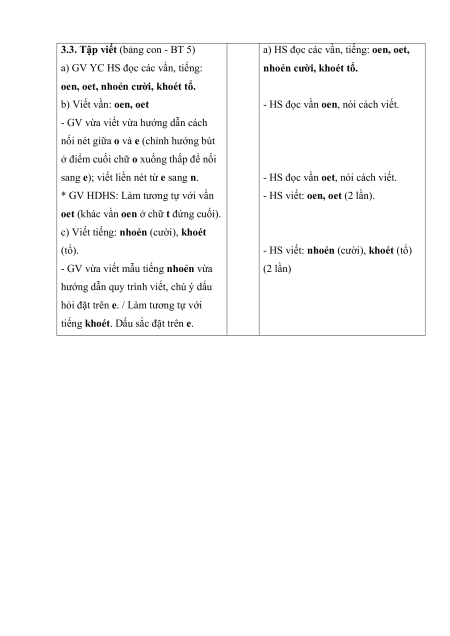 - Viết đúng các vần oen, oet, các tiếng nhoẻn (cười), khoét (tổ) cỡ vừa (trên bảng con)