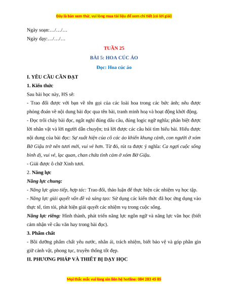 Ngày soạn:…/…/… Ngày dạy:…/…/… TUẦN 25 BÀI 5: HOA CÚC ÁO Đọc: Hoa cúc áo