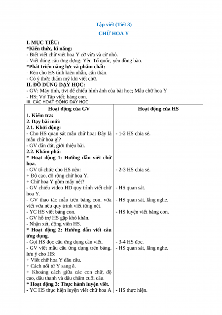 _______________________________________ Tập viết (Tiết 3) CHỮ HOA Y I. MỤC TIÊU: *Kiến thức, kĩ năng: