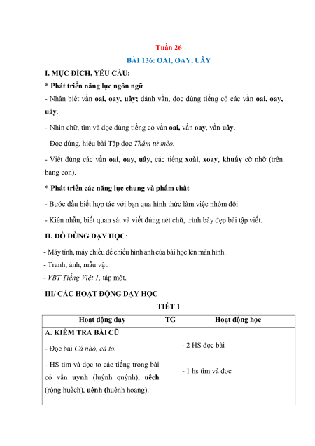 Tuần 26 BÀI 136: OAI, OAY, UÂY I. MỤC ĐÍCH, YÊU CẦU: