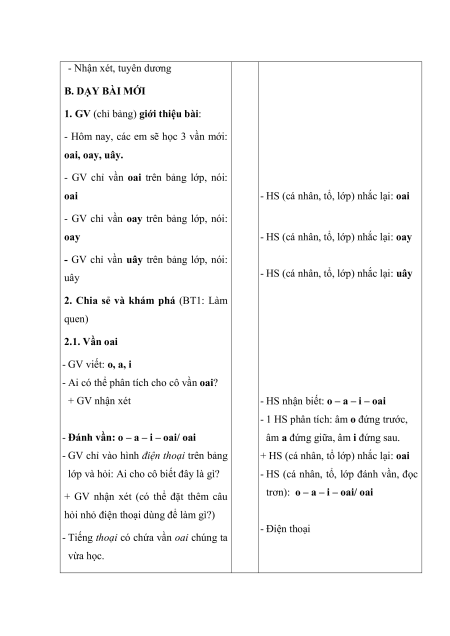 2. Chia sẻ và khám phá (BT1: Làm quen) 2.1. Vần oai - GV viết: o, a, i