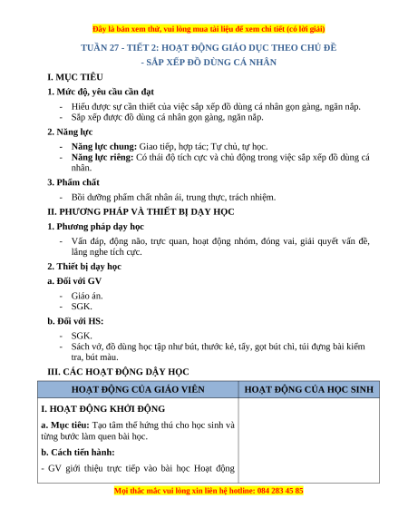 - Năng lực riêng: Có thái độ tích cực và chủ động trong việc sắp xếp đồ dùng cá nhân. 3. Phẩm chất