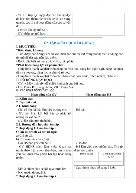 ÔN TẬP GIỮA HỌC KÌ II (Tiết 5+6) I. MỤC TIÊU: *Kiến thức, kĩ năng: