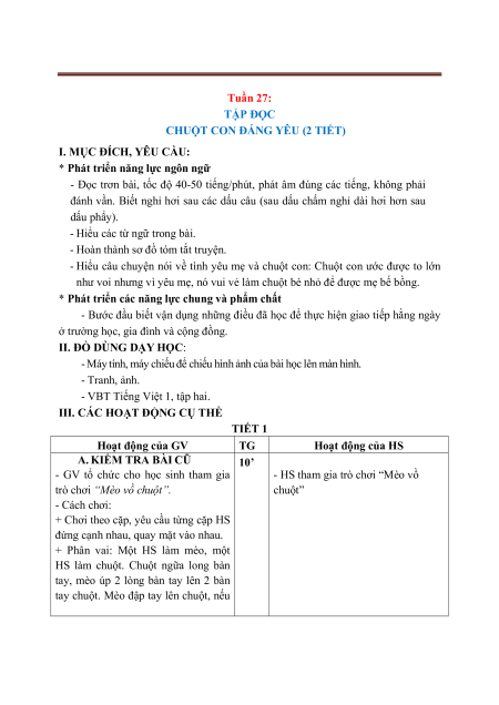 CHUỘT CON ĐÁNG YÊU (2 TIẾT) I. MỤC ĐÍCH, YÊU CẦU: