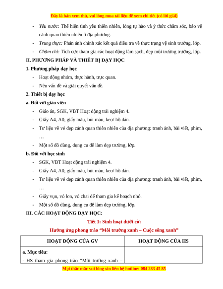 Hưởng ứng phong trào “Môi trường xanh – Cuộc sống xanh” HOẠT ĐỘNG CỦA GV HOẠT ĐỘNG CỦA HS a. Mục tiêu:
