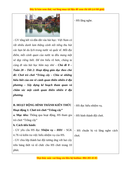kế hoạch tham quan và chăm sóc một cảnh quan thiên nhiên ở địa phương HOẠT ĐỘNG CỦA GV HOẠT ĐỘNG CỦA HS