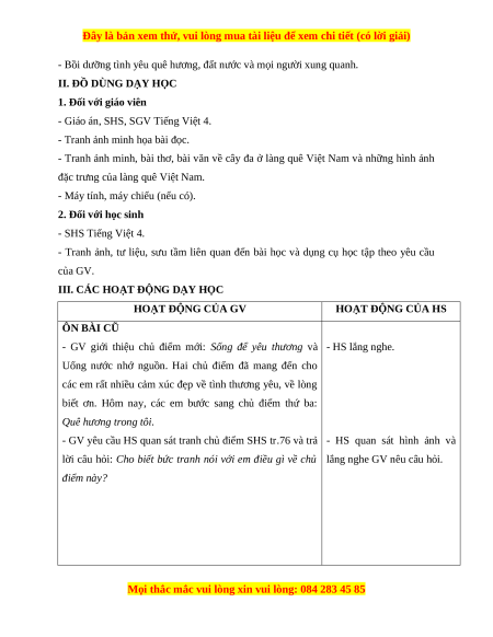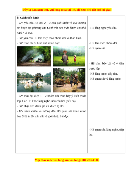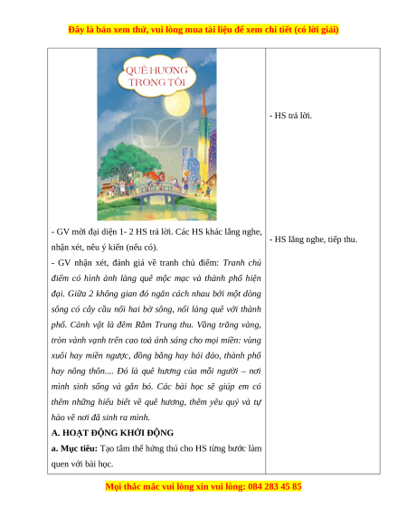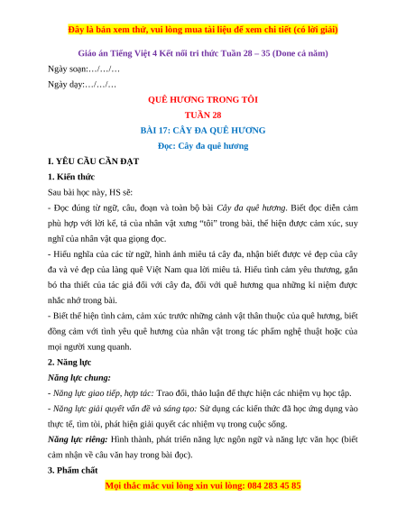 Giáo án Tiếng Việt 4 Kết nối tri thức Tuần 28 – 35 (Done cả năm) Ngày soạn:…/…/… Ngày dạy:…/…/… QUÊ HƯƠNG TRONG TÔI TUẦN 28