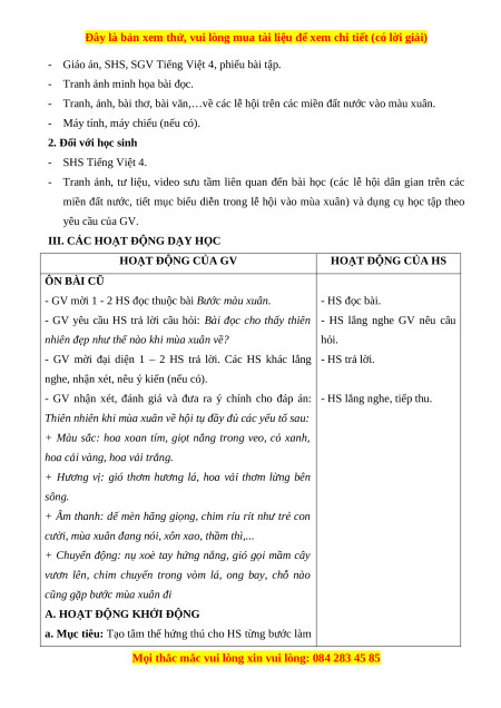 miền đất nước, tiết mục biểu diễn trong lễ hội vào mùa xuân) và dụng cụ học tập theo yêu cầu của GV.