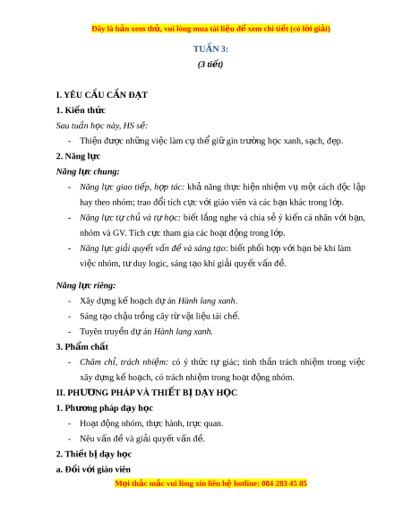 ệ đ xe ể m chi ti t (c ế ó lời gi i ả ) TUẦN 3: (3 ti t ế ) I. YÊU C U Ầ C N Ầ Đ T Ạ 1. Ki n ế th c ứ Sau tu n ầ h c ọ này, HS s : ẽ - Thi n ệ đ c ượ nh n ữ g vi c ệ làm c ụ th ể gi ữ gìn tr n ườ g h c ọ xanh, s ch ạ , đ p ẹ . 2. Năng l c ự Năng l c ự chung: - Năng l c ự giao ti p ế , h p