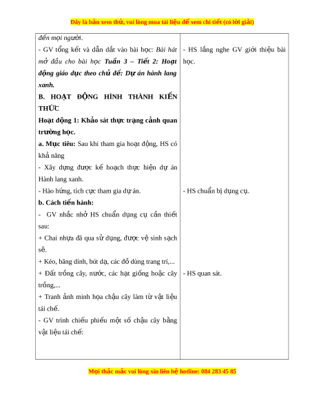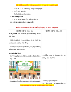 ệ đ xe ể m chi ti t (c ế ó lời gi i ả ) - Giáo án, SGK, VBT Ho t ạ đ n ộ g tr i ả nghi m ệ 4. - Gi y ấ , bút, bút màu. - Phi u ế kh o ả sát theo m u ẫ . b. Đ i ố v i ớ h c ọ sinh - SGK, VBT Ho t ạ đ n ộ g tr i ả nghi m ệ 4. III. CÁC HO T Ạ Đ N Ộ G DẠY H C Ọ Tiết 1: Sinh ho t ạ dư i ớ c : ờ Hư ng ở n ứ g d ự án Hành lang xanh HO T Ạ ĐỘNG C A Ủ GV HO T Ạ ĐỘNG C A Ủ HS a. M c