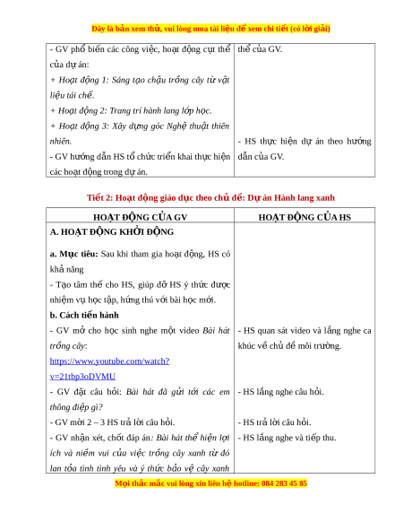 ộ g 2: Trang trí hành lang l p ớ h c. ọ + Ho t ạ đ n ộ g 3: Xây d n ự g góc Nghệ thu t ậ thiên nhiên. - HS th c ự hi n ệ dự án theo h n ướ g - GV h n ướ g d n ẫ HS t ổ ch c ứ tri n ể khai th c ự hi n ệ dẫn c a ủ GV. các ho t ạ đ n ộ g trong d ự án. Tiết 2: Ho t ạ đ ng ộ giáo d c ụ theo ch ủ đ : ề D ự án Hành lang xanh HO T Ạ ĐỘNG C A Ủ GV HO T Ạ ĐỘNG C A Ủ HS A. HOẠT ĐỘNG KH I Ở Đ N Ộ G a. M c