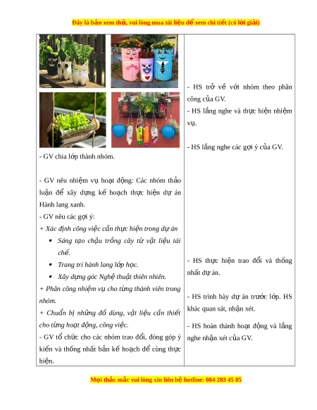 ệ đ xe ể m chi ti t (c ế ó lời gi i ả ) - GV phổ bi n ế các công vi c, ệ ho t ạ đ n ộ g c t ụ thể th ể c a ủ GV. c a ủ d ự án: + Ho t ạ đ n ộ g 1: Sáng t o ạ ch u ậ tr n ồ g cây từ v t ậ li u ệ tái ch . ế + Ho t ạ đ n