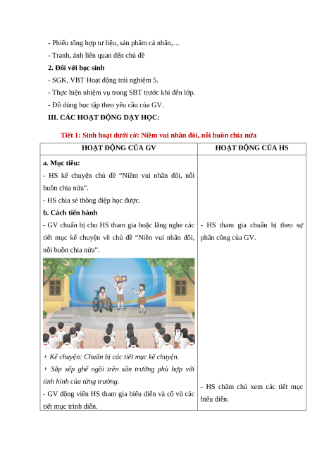 Tiết 1: Sinh hoạt dưới cờ: Niềm vui nhân đôi, nỗi buồn chia nửa HOẠT ĐỘNG CỦA GV HOẠT ĐỘNG CỦA HS a. Mục tiêu: