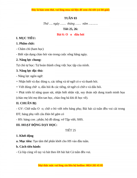 Bài 6: O o dấu hỏi I. MỤC TIÊU: 1. Phẩm chất: - Chăm chỉ (ham học)
