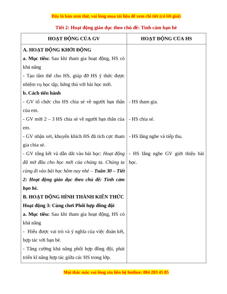 Tiết 2: Hoạt động giáo dục theo chủ đề: Tình cảm bạn bè HOẠT ĐỘNG CỦA GV HOẠT ĐỘNG CỦA HS