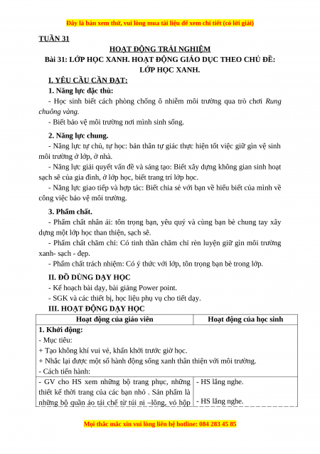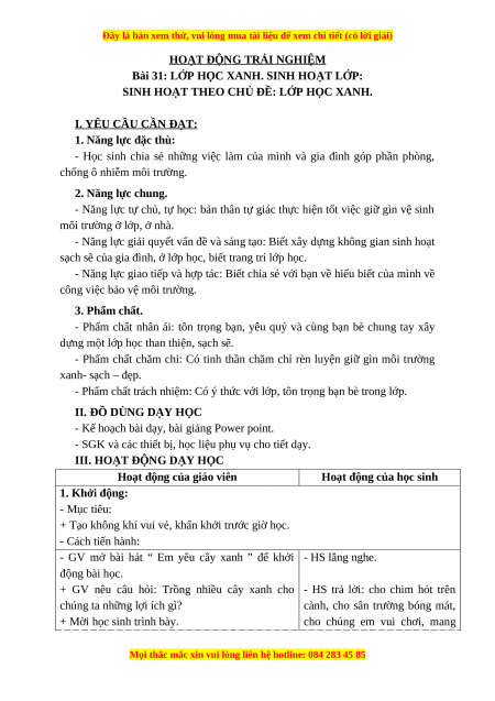 Bài 31: LỚP HỌC XANH. HOẠT ĐỘNG GIÁO DỤC THEO CHỦ ĐỀ: LỚP HỌC XANH. I. YÊU CẦU CẦN ĐẠT: 1. Năng lực đặc thù: