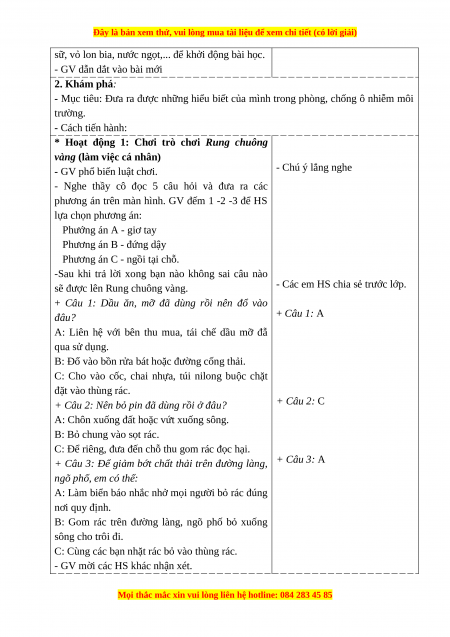 - Học sinh biết cách phòng chống ô nhiễm môi trường qua trò chơi Rung chuông vàng.