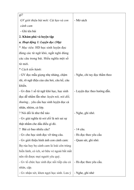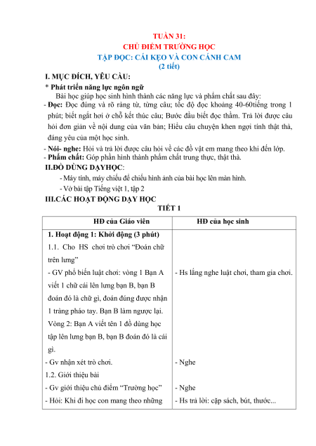 TẬP ĐỌC: CÁI KẸO VÀ CON CÁNH CAM (2 tiết) I. MỤC ĐÍCH, YÊU CẦU: