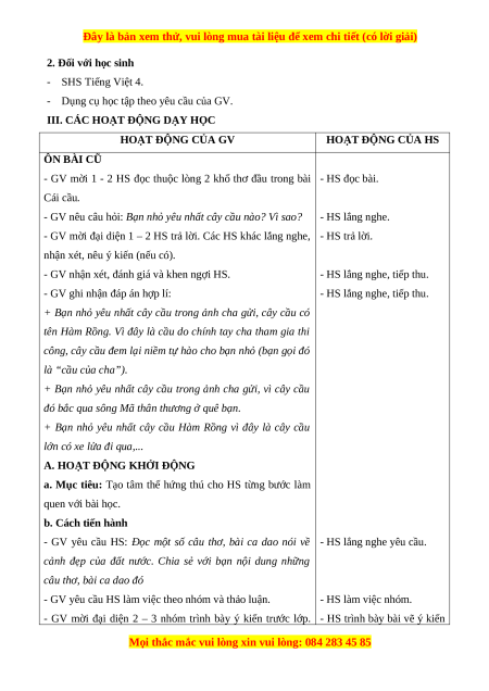 - GV nêu câu hỏi: Bạn nhỏ yêu nhất cây cầu nào? Vì sao? - HS lắng nghe.