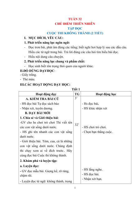 CUỘC THI KHÔNG THÀNH (2 TIẾT) I. MỤC ĐÍCH, YÊU CẦU: