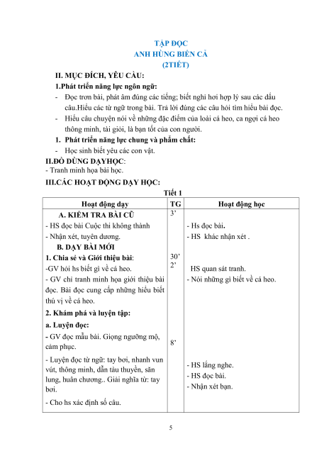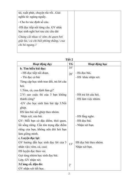 giật lùi,/ cá chỉ biết phóng thẳng,/ cua chỉ bò ngang.// Tiết 2 Hoạt động dạy TG Hoạt động học b. Tìm hiểu bài đọc: 35’