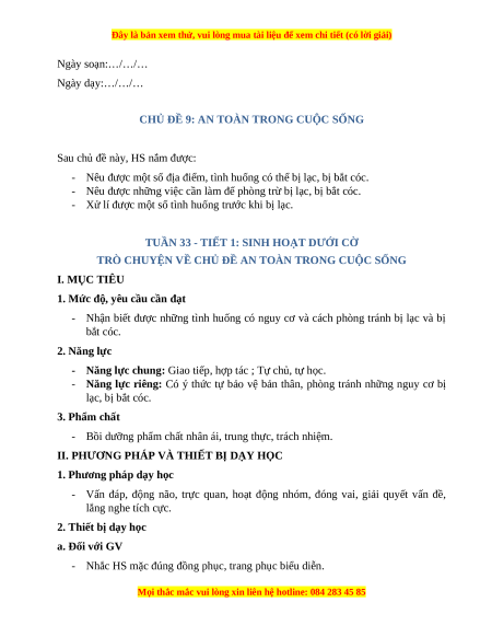 - Năng lực riêng: Có ý thức tự bảo vệ bản thân, phòng tránh những nguy cơ bị lạc, bị bắt cóc. 3. Phẩm chất