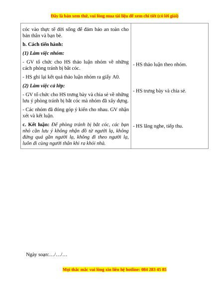 Hoạt động 2: Cách phòng tránh bị bắt cóc a. Mục tiêu: