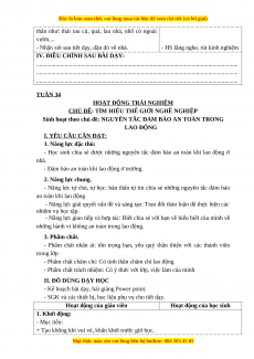 Sinh hoạt theo chủ đề: NGUYÊN TẮC ĐẢM BẢO AN TOÀN TRONG LAO ĐỘNG I. YÊU CẦU CẦN ĐẠT: 1. Năng lực đặc thù:
