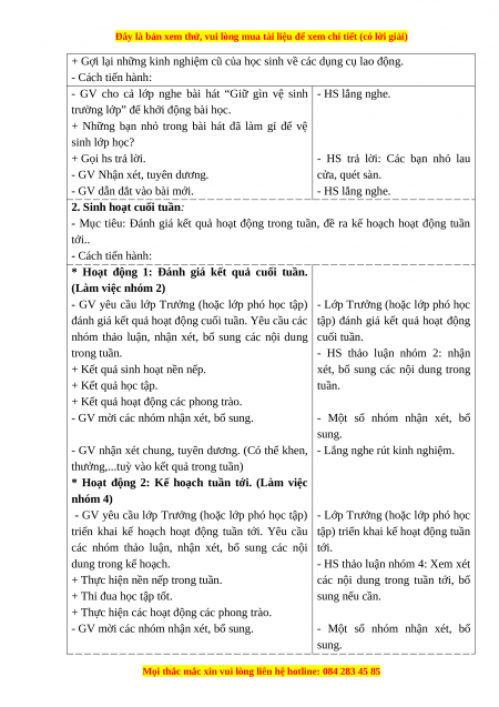 - Mục tiêu: Đánh giá kết quả hoạt động trong tuần, đề ra kế hoạch hoạt động tuần