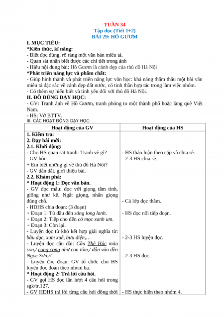 Tập đọc (Tiết 1+2) BÀI 29: HỒ GƯƠM I. MỤC TIÊU: *Kiến thức, kĩ năng: