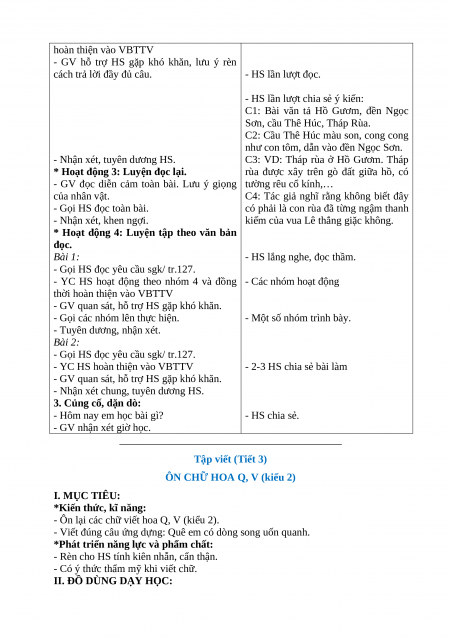 ÔN CHỮ HOA Q, V (kiểu 2) I. MỤC TIÊU: *Kiến thức, kĩ năng: