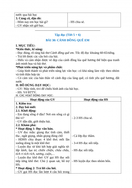 - Đọc đúng, rõ ràng bài thơ Cánh đồng quê em. Tốc độ đọc khoảng 60-65/tiếng.