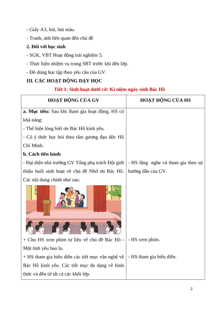 thiệu buổi sinh hoạt về chủ đề Nhớ ơn Bác Hồ. hướng dẫn của GV.