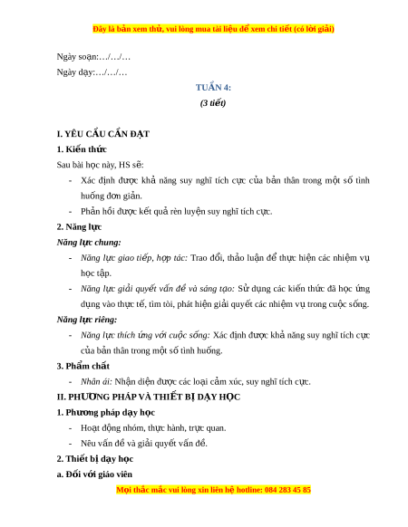 ượ khả năng suy nghĩ tích c c ự c a ủ b n ả thân trong m t ộ số tình hu n ố g đ n ơ gi n ả . - Ph n ả h i ồ đ c ượ k t ế qu ả rèn luy n ệ suy nghĩ tích c c ự . 2. Năng l c ự Năng l c ự chung: - Năng l c ự giao ti p ế , h p ợ tác: Trao đ i ổ , th o ả lu n ậ để th c ự hi n ệ các nhi m ệ vụ h c ọ t p ậ . - Năng l c ự gi i ả quy t ế v n ấ đề và sáng t o ạ : Sử d n ụ g các ki n ế th c ứ đã h c ọ n ứ g d n ụ g vào th c ự t , ế tìm tòi, phát hi n ệ gi i ả quy t ế các nhi m ệ v ụ trong cu c ộ s n ố g. Năng l c ự riêng: - Năng l c ự thích n ứ g v i ớ cu c ộ s n ố g: Xác đ n ị h đ c ượ kh ả năng suy nghĩ tích c c ự c a ủ b n ả thân trong m t ộ s ố tình hu n ố g. 3. Phẩm ch t ấ
