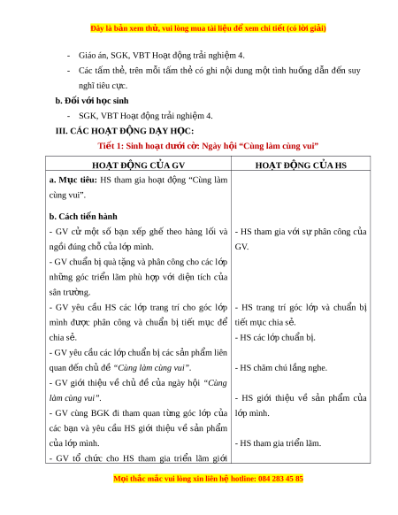 ệ đ xe ể m chi ti t (c ế ó lời gi i ả ) - Giáo án, SGK, VBT Ho t ạ đ n ộ g tr i ả nghi m ệ 4. - Các t m ấ th , ẻ trên m i ỗ t m ấ thẻ có ghi n i ộ dung m t ộ tình hu n ố g d n ẫ đ n ế suy nghĩ tiêu c c. ự b. Đ i ố v i ớ h c ọ sinh - SGK, VBT Ho t ạ đ n ộ g tr i ả nghi m ệ 4. III. CÁC HO T Ạ Đ N Ộ G DẠY H C Ọ : Tiết 1: Sinh ho t ạ dư i ớ c : ờ Ngày h i