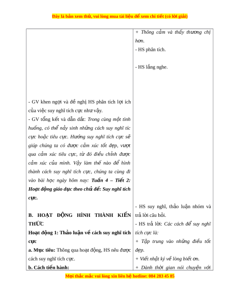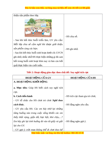 ả phẩm cùng các b n ạ . - HS ghi nh . ớ - Sau khi k t ế thúc bu i ổ sinh ho t ạ d i ướ c , ờ GVCN ghi nh , ớ nh c ắ nh ở HS th c ự hi n ệ nh n ữ g gì đã cam k t ế trong bu i ổ sinh ho t ạ hôm nay và báo cáo k t ế qu ả th c ự hi n ệ vào cu i ố tu n ầ . Tiết 2: Ho t ạ đ ng ộ giáo d c ụ theo ch ủ đ : ề Suy nghĩ tích c c ự HO T Ạ ĐỘNG C A Ủ GV HO T Ạ ĐỘNG C A Ủ HS A. HOẠT ĐỘNG KH I Ở Đ N Ộ G a. M c
