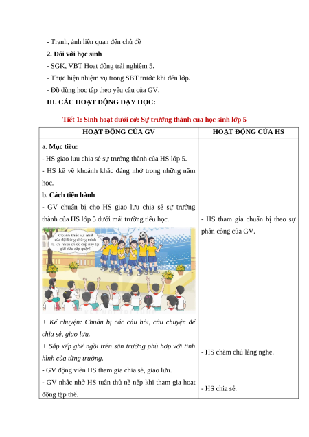 Tiết 1: Sinh hoạt dưới cờ: Sự trưởng thành của học sinh lớp 5 HOẠT ĐỘNG CỦA GV HOẠT ĐỘNG CỦA HS a. Mục tiêu: