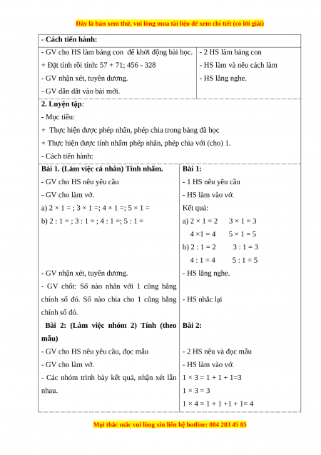 + Thực hiện được tính nhẩm phép nhân, phép chia với (cho) 1. - Cách tiến hành: