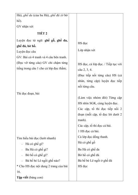 Hà), ghế da (của ba Hà), ghế đá (ở bờ hồ). GV nhận xét TIẾT 2
