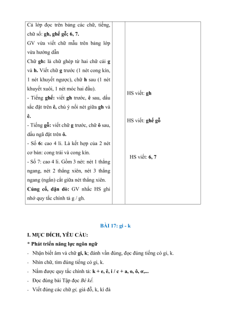 - Viết đúng các chữ gh, tiếng ghế gỗ; chữ số: 6, 7 (trên bảng con).