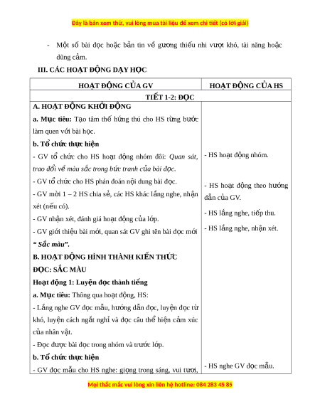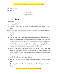 Ngày so n ạ :…/…/… Ngày d y ạ :…/…/… TUẦN 4: BÀI 7: S C Ắ MÀU I. YÊU C U Ầ C N Ầ Đ T Ạ 1. Ki n ế th c ứ Sau bài h c ọ này, HS s : ẽ - Quan sát, trao đ i ổ đ c ượ v i ớ b n ạ v ẻ màu s c ắ trong b c ứ tranh c a ủ bài đ c, ọ nêu đ c ượ ph n ỏ g đoán c a ủ b n ả thân về n i ộ dung bài đ c ọ qua tên bài, ho t ạ đ n ộ g kh i ở đ n ộ g và tranh minh h a. ọ - Đ c: ọ Đ c ọ trôi ch y ả bài đ c, ọ ng t ắ nghir đúng nh p ị th , ơ đúng logic ng ữ nghĩa; tr ả l i ờ đ c ượ các câu h i ỏ tìm hi u ể bài. Hi u ể đ c ượ n i ộ dung bài đ c: ọ Trong b c ứ tranh c a ủ b n ạ nh , ỏ m i ỗ sự v t ậ đ u ề có màu s c ắ riêng, màu s c ắ nào cũng đ p ẹ và có