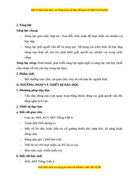 - Giáo án, SHS, SGV, SBT Ti n ế g Vi t ệ 4. - Tranh n ả h SHS phóng to. - M t ộ số bài đ c ọ ho c ặ b n ả tin về g n ươ g thi u ế nhi v t ượ khó, tài năng ho c ặ dũng c m. ả - B n ả g ph ụ ghi 2 kh ổ th ơ cu i ố . - Th ẻ t ừ cho HS th c ự hi n ệ các BT t ừ và câu. - Máy tính, máy chi u ế (n u ế có). b. Đ i ố v i ớ h c ọ sinh - SHS, SBT Ti n ế g Vi t ệ 4.