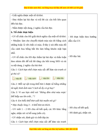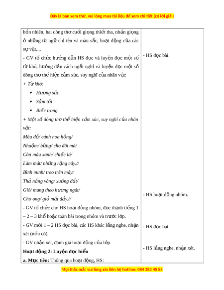ữ g từ ngữ chỉ tên và màu s c ắ , ho t ạ đ n ộ g c a ủ các s ự v t ậ ,... - GV tổ ch c ứ h n ướ g d n ẫ HS đ c ọ và luy n ệ đ c ọ m t ộ số - HS đ c ọ bài. từ khó, h n ướ g d n ẫ cách ng t ắ nghỉ và luy n ệ đ c ọ m t ộ số dòng th ơ th ể hi n ệ c m ả xúc, suy nghĩ c a ủ nhân v t ậ : + T ừ khó: H n ươ g s c ắ Sẫm t i ố Bi c ế trong + M t ộ số dòng th ơ th ể hi n ệ c m ả xúc, suy nghĩ c a ủ nhân v t ậ : Màu đ / ỏ cánh hoa h n ồ g/ Nhu m ộ / b n ừ g/ cho đôi má/ Còn màu xanh/ chi c ế lá/ Làm mát/ nh n ữ g r n ặ g cây.//