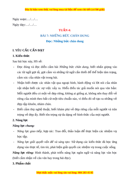 Đây là bản xem th , vu ử i lòng mua tài li u ệ đ xe ể m chi ti t ế (có l i ờ gi i ả ) Ngày so n: ạ …/…/… Ngày d y: ạ …/…/… TUẦN 4: BÀI 7: NH N Ữ G BỨC CHÂN DUNG Đ c: ọ Những b c chân d ứ ung