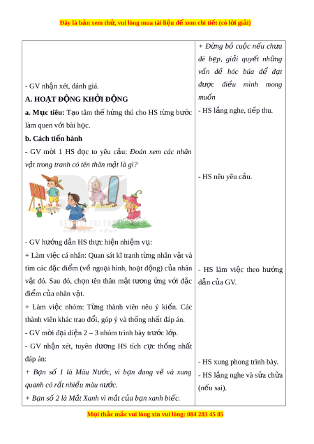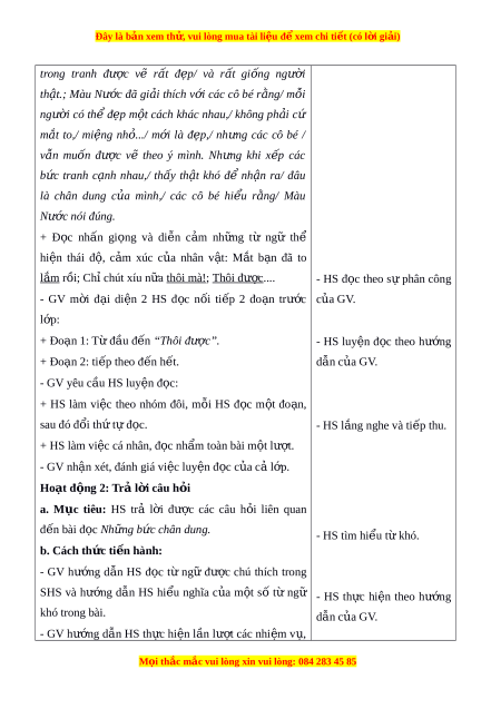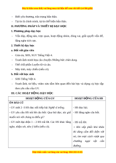 Đây là bản xem th , vu ử i lòng mua tài li u ệ đ xe ể m chi ti t ế (có l i ờ gi i ả ) - Bi t ế yêu thư ng, t ơ rân tr ng ọ b n t ả hân. - T t ự in là chính mình, t t ự in th hi ể n b ệ n t ả hân. II. PHƯ N Ơ G PHÁP VÀ THI T Ế B D Ị Y Ạ H C Ọ 1. Phư ng ơ pháp d y h ạ c ọ - Vấn đáp, đ ng ộ não, tr c ự quan, ho t ạ đ ng ộ nhóm, đóng vai, gi i ả quy t ế v n ấ đ , ề l ng ắ nghe tích c c. ự 2. Thi t ế b d ị y h ạ c ọ a. Đ i ố v i ớ giáo viên - Giáo án, SHS, SGV Ti ng ế Vi t ệ 4. - Tranh nh m ả inh h a câu ọ chuy n ệ Nh ng b ữ c ứ chân dung. - Th ch ẻ ph ữ n L ầ uy n t ệ và câu. ừ - Máy tính, máy chi u ( ế n u có) ế . b. Đ i ố v i ớ h c s ọ inh - SHS Ti ng ế Vi t ệ 4. - Tranh nh, ả tư li u, ệ video s u ư t m ầ liên quan đ n ế bài h c ọ và d ng ụ cụ h c ọ t p ậ theo yêu c u c ầ a ủ GV. III. CÁC HO T Ạ Đ N Ộ G D Y Ạ H C Ọ HOẠT Đ N Ộ G C A Ủ GV HOẠT Đ N Ộ G C A Ủ HS ÔN BÀI CŨ - GV m i ờ 2 -3 HS đ c n ọ i ố ti p