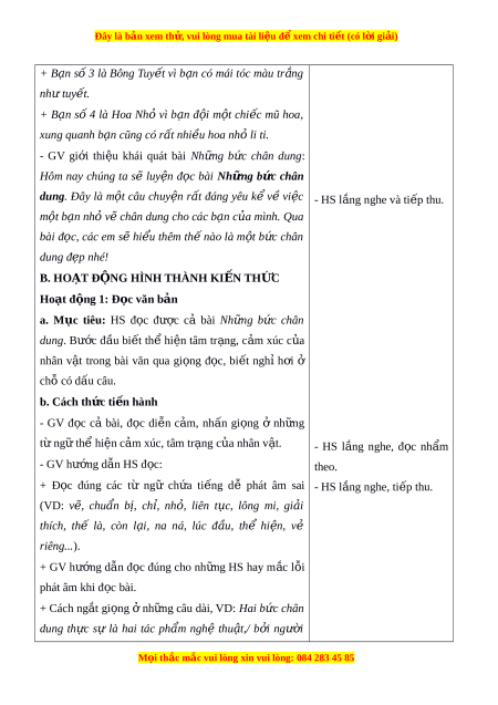 dung. Đây là m t ộ câu chuy n ệ r t ấ đáng yêu k ể v ề vi c ệ - HS l ng ắ nghe và ti p t ế hu. m t ộ b n ạ nh v ỏ chân dung cho các b ẽ n ạ c a m ủ ình. Qua bài đ c, ọ các em sẽ hi u ể thêm th ế nào là m t ộ b c ứ chân dung đẹp nhé! B. HOẠT Đ N Ộ G HÌNH THÀNH KI N Ế TH C Ứ Hoạt đ ng 1: ộ Đ c văn b ọ n ả a. M c ụ tiêu: HS đ c ọ đư c ợ cả bài Nh ng ữ b c ứ chân dung. Bư c ớ đ u ầ bi t ế thể hi n ệ tâm tr ng, ạ c m ả xúc c a ủ nhân v t ậ trong bài văn qua gi ng ọ đ c, ọ bi t ế nghỉ h i ơ ở chỗ có dấu câu. b. Cách th c t ứ i n hành ế - GV đ c ọ cả bài, đ c ọ di n ễ c m ả , nh n ấ gi ng ọ ở nh ng ữ t ng ừ t ữ h hi ể n c ệ m ả xúc, tâm tr ng ạ c a nhân v ủ t ậ . - HS l ng ắ nghe, đ c ọ nh m ẩ - GV hư ng d ớ ẫn HS đ c: ọ theo. + Đ c