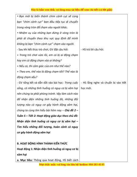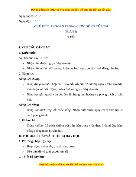 Ề 2: AN TOÀN TRONG CU C Ộ S N Ố G C A Ủ EM TUẦN 5: (3 ti t ế ) I. YÊU C U Ầ C N Ầ Đ T Ạ 1. Ki n ế th c ứ Sau bài h c ọ này, HS s : ẽ - Nh n ậ bi t ế đ c ượ nguy c ơ b ịxâm h i ạ . - Nh n ậ bi t ế nh n ữ g đ i ố t n ượ g, hoàn c n ả h có nguy c ơ gây hành đ n ộ g xâm h i ạ . 2. Năng l c ự Năng l c ự chung: - Năng l c ự giao ti p ế , h p ợ tác: Trao đ i ổ v i ớ b n ạ về nh n ữ g nguy c ơ bị xâm h i ạ , th o ả lu n ậ v ề đ i ố t n ượ g, hoàn c n ả h có nguy c ơ b ịxâm h i ạ . - Năng l c ự gi i ả quy t ế v n ấ đ : ề Xử lí nh n ữ g tình hu n