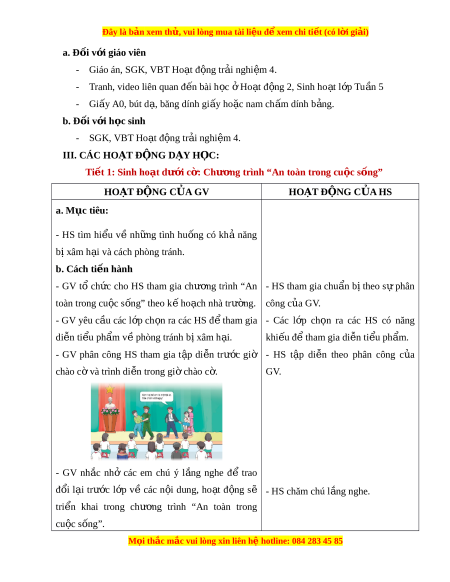 ệ đ xe ể m chi ti t (c ế ó lời gi i ả ) a. Đ i ố v i ớ giáo viên - Giáo án, SGK, VBT Ho t ạ đ n ộ g tr i ả nghi m ệ 4. - Tranh, video liên quan đ n ế bài h c ọ ở Ho t ạ đ n ộ g 2, Sinh ho t ạ l p ớ Tu n ầ 5 - Gi y ấ A0, bút d , ạ băng dính gi y ấ ho c ặ nam ch m ấ dính b n ả g. b. Đ i ố v i ớ h c ọ sinh - SGK, VBT Ho t ạ đ n ộ g tr i ả nghi m ệ 4. III. CÁC HO T Ạ Đ N Ộ G DẠY H C Ọ : Tiết 1: Sinh ho t ạ dư i ớ c : ờ Chư ng