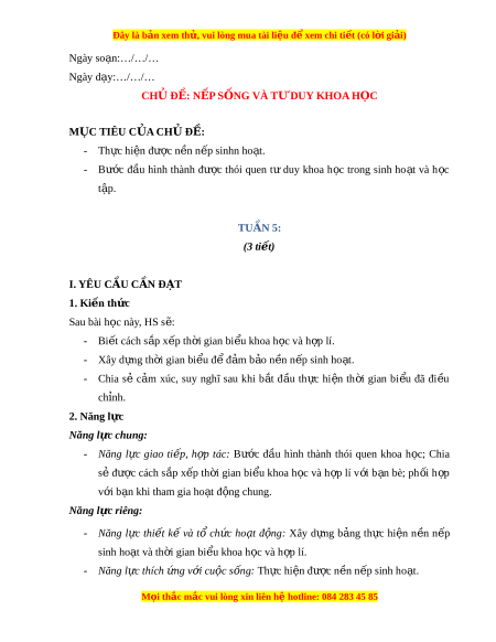 ượ thói quen tư duy khoa h c ọ trong sinh ho t ạ và h c ọ t p ậ . TUẦN 5: (3 ti t ế ) I. YÊU C U Ầ C N Ầ Đ T Ạ 1. Ki n ế th c ứ Sau bài h c ọ này, HS s : ẽ - Bi t ế cách s p ắ x p ế th i ờ gian bi u ể khoa h c ọ và h p ợ lí. - Xây d n ự g th i ờ gian bi u ể đ ể đ m ả b o ả n n ề n p ế sinh ho t ạ . - Chia sẻ c m